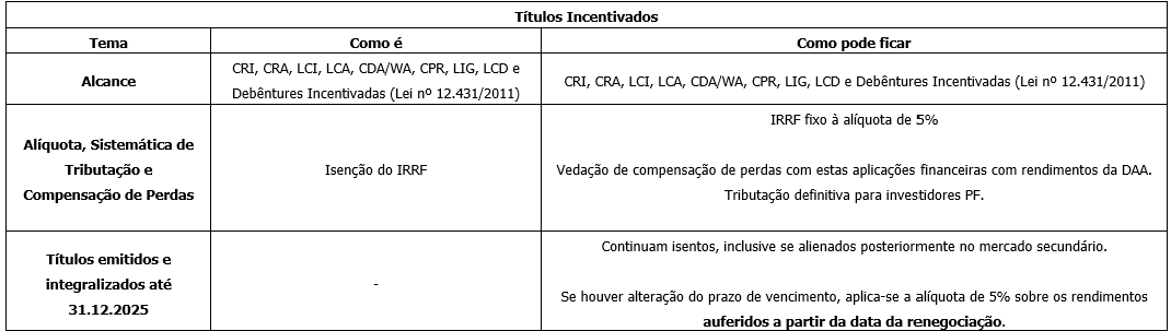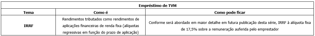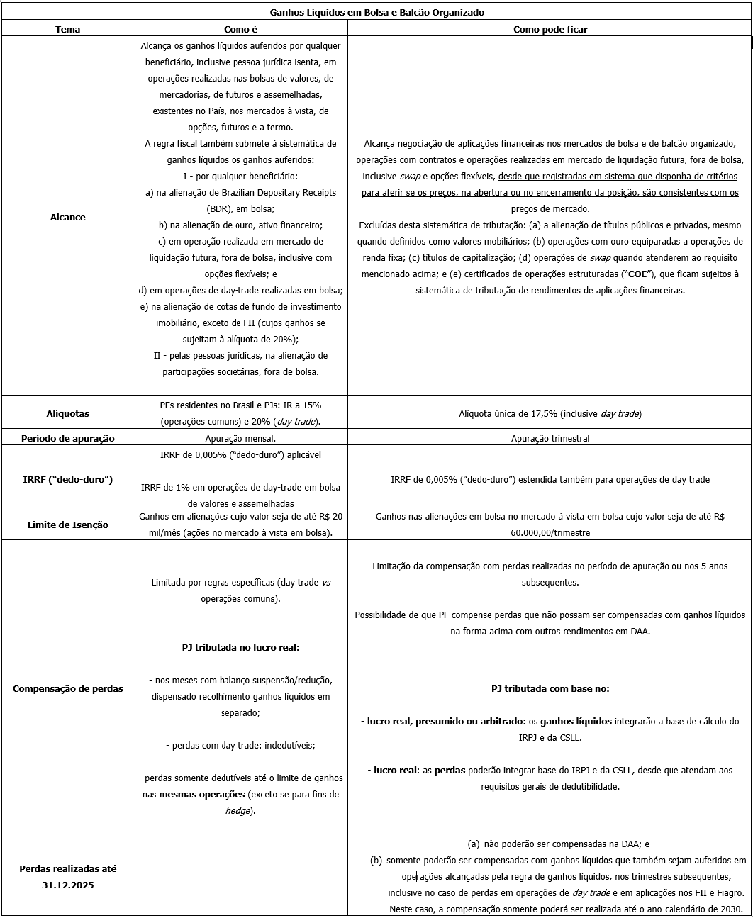 A tabela abaixo faz parte de uma série de publicações que faremos a respeito do tema, e contempla os principais aspectos dessas alterações, particularmente no que se refere à tributação das aplicações financeiras, títulos incentivados, ganhos líquidos e empréstimo de títulos e valores mobiliários, considerando as regras atualmente vigentes e as alterações propostas pela Medida Provisória: